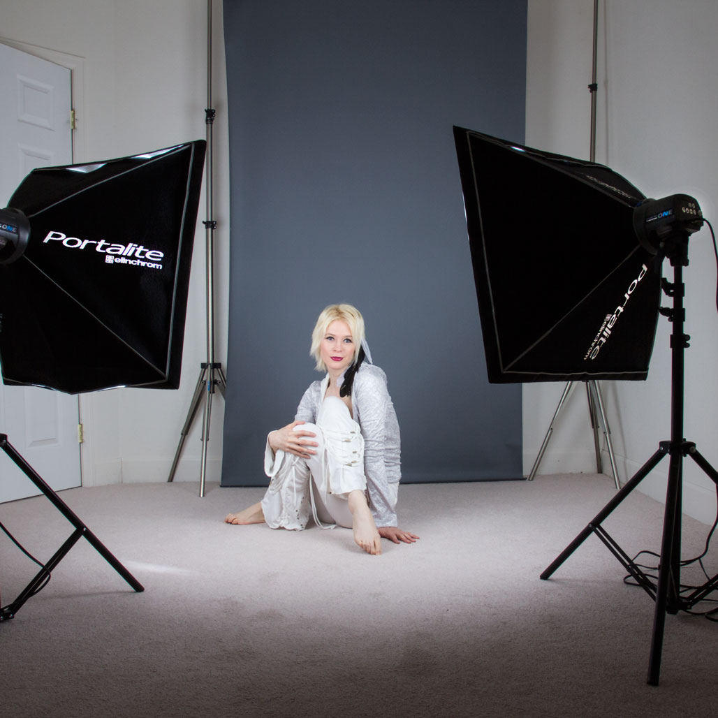 How I made this photograph: This portrait of Pam Simpson dressed in white and silver was made with her seated on my home studio’s floor. As you can see in the above right setup shot, two Elinchrom D-Lite RX monolights with a 26-inch square Portalite lightbanks attached were placed approximately 45 degrees to one another. The lightstands were lowered to match Pam’s seated pose. The output of each monolight was adjusted via my laptop computer to be approximately one-quarter power. The backdrop is a 5×7-foot Photo Gray Savage Infinity vinyl.