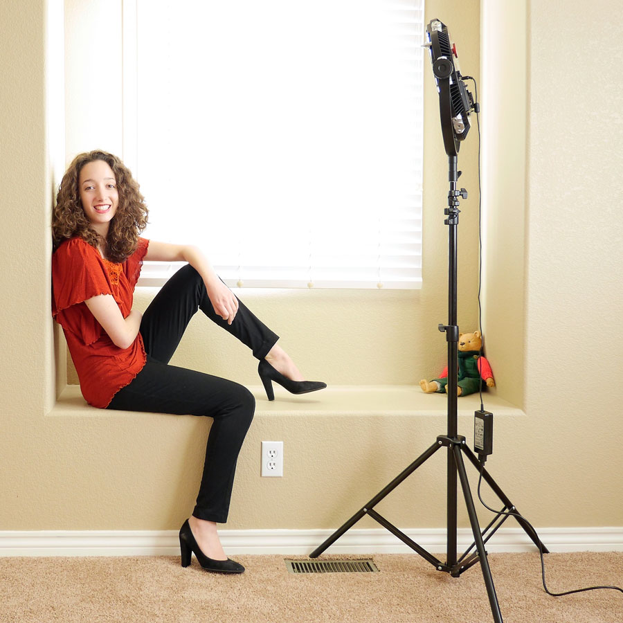 How I Made this Portrait: I photographed aspiring model Laura May Bachmayer in the guest bedroom of my home and this is the first acceptable result I’ve been able to get when shooting in the inherently contrasty South-facing window light in this room, even though for this shot, the white wooden blinds are closed tight. As you can see in the above right setup shot, the Anova LED light was placed at camera right and color balanced using Rotolight’s Magic Eye app. The camera used was a Panasonic Lumix GH4 with Lumix G Vario 12-35mm f/2.8 lens (at 33mm) with an exposure of 1/200 sec at f/2.8 and ISO 800 with a plus two and one-third stop exposure compensation,