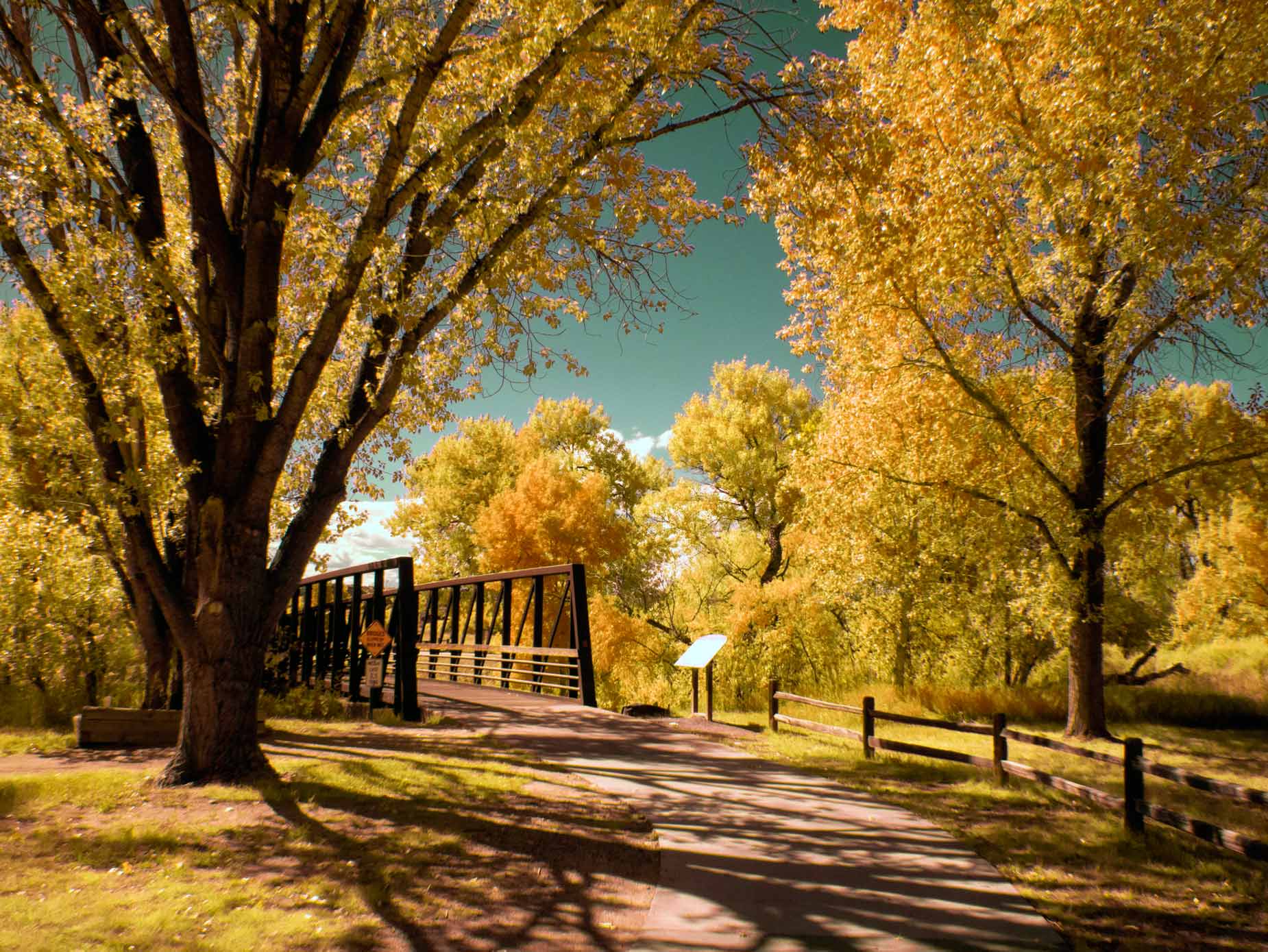 How I Made this Photograph: This is NOT a fall photograph but was made last weekend in McCabe Meadows in Parker, Colorado. You can see what the SOOC image file I captured looks like at above right. The image was processed using one of the actions that Life Pixel previously included when you had a camera converted for infrared capture. (I don’t know of they still do this.) The Av exposure was 1/640 sec at f/16 and ISO 400.