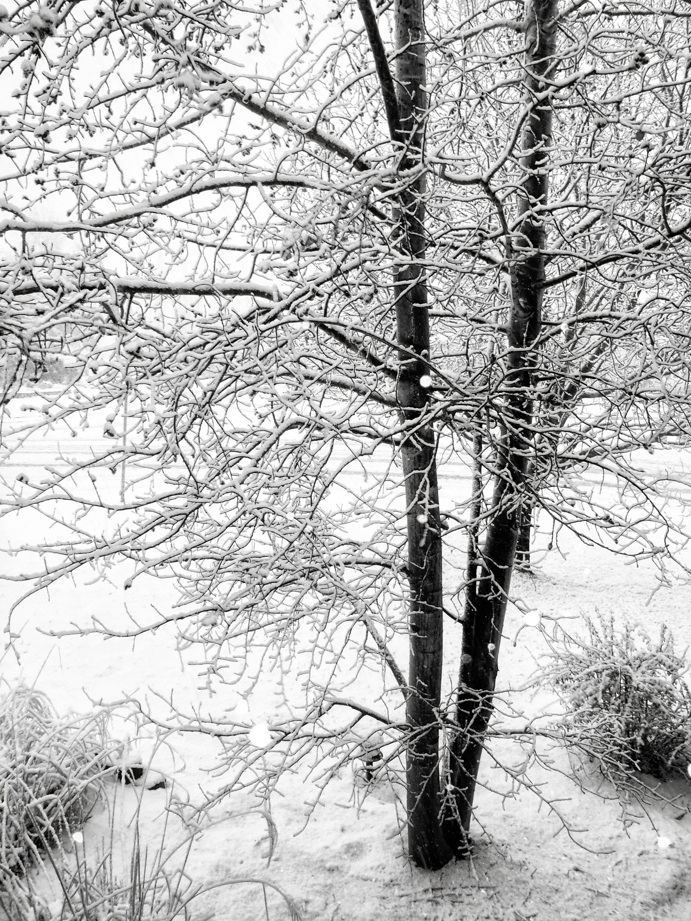 How I Made this Photograph: I’ve often written about making photographs “in your own backyard.” This image was made in the front yard of my former home while it was snowing. That’s what those white dots you see in the image are from; the built-in flash was fired! The camera used was the Olympus Stylus Tough 8010 with the built-in lens at 28mm (equivalent.) The Manual exposure was 1/30 sec at f/3.9 and SO 125/ The original color JPEG file was converted to black and white with Silver Efex because I felt the image was mostly monochrome anyway.
