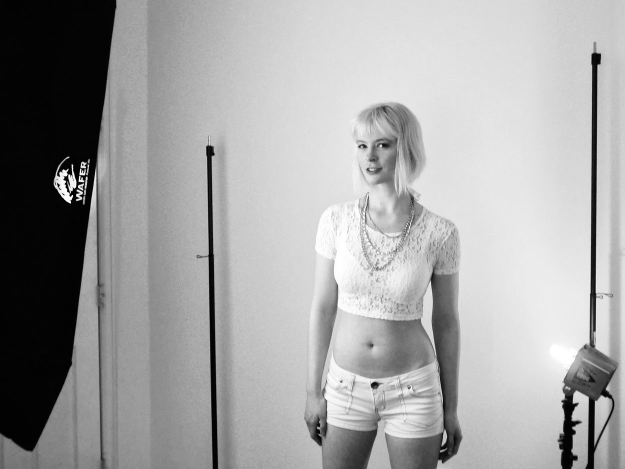 How I made this portrait: I photographed Pam Simpson aka Satin Pam in my home studio using one of its white walls as a background (before it was painted a more-or-less 18% grey. ) As you can see in the lighting setup photograph (above right) a Plume Ltd Wafer soft box was located at camera left. This soft box is available in different sizes and shapes, including the Wafer HexOval 100 (37.5 x 27.5 by 12 inches deep) I use. A Paul C Buff DigiBee 800 monolight is attached to the softbox with a Balcar-compatible speed ring. My Purple Haze Paul C Buff Alien Bee 800 monolight is placed low and at camera right and is used in bare tube mode and is more-or-less aimed toward the the wall but there is so much much bounce in a white-painted studio that it’s everywhere.
